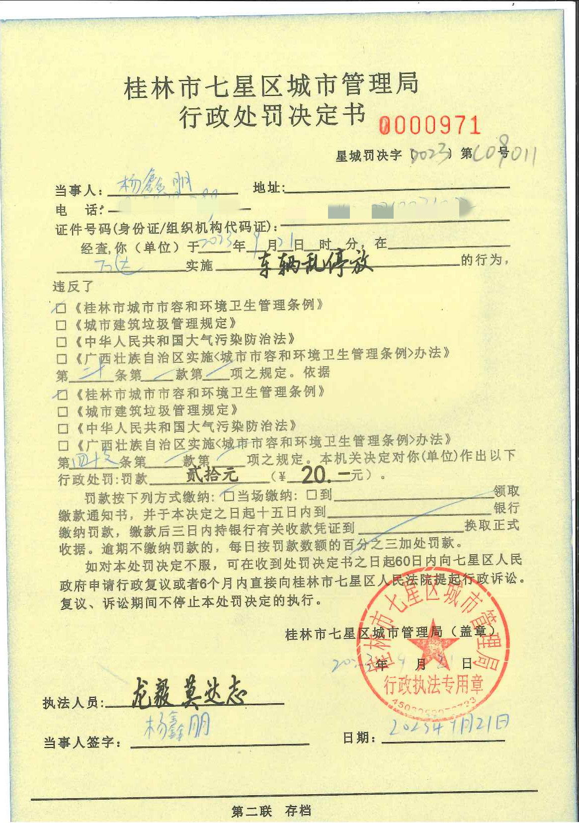 桂林市七星区城市管理局行政处罚决定书星城罚决字〔2023〕第C009011号-杨鑫朋