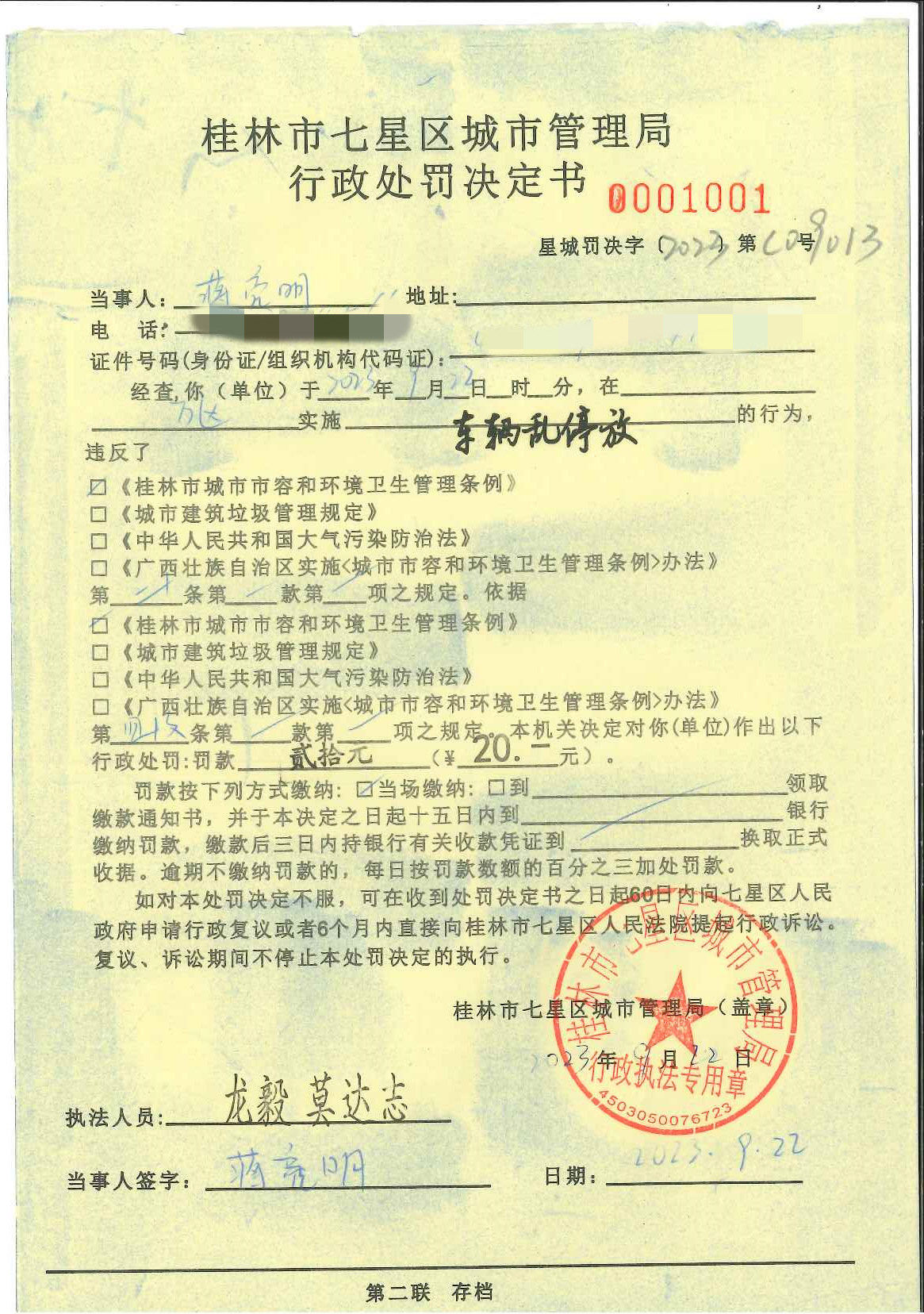 桂林市七星区城市管理局行政处罚决定书星城罚决字〔2023〕第C009013号-蒋亮明
