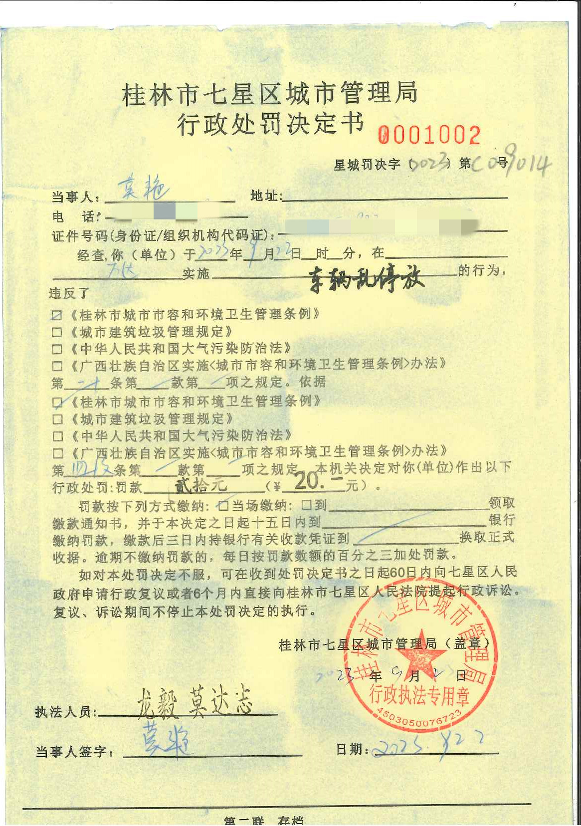 桂林市七星区城市管理局行政处罚决定书星城罚决字〔2023〕第C009014号-莫艳