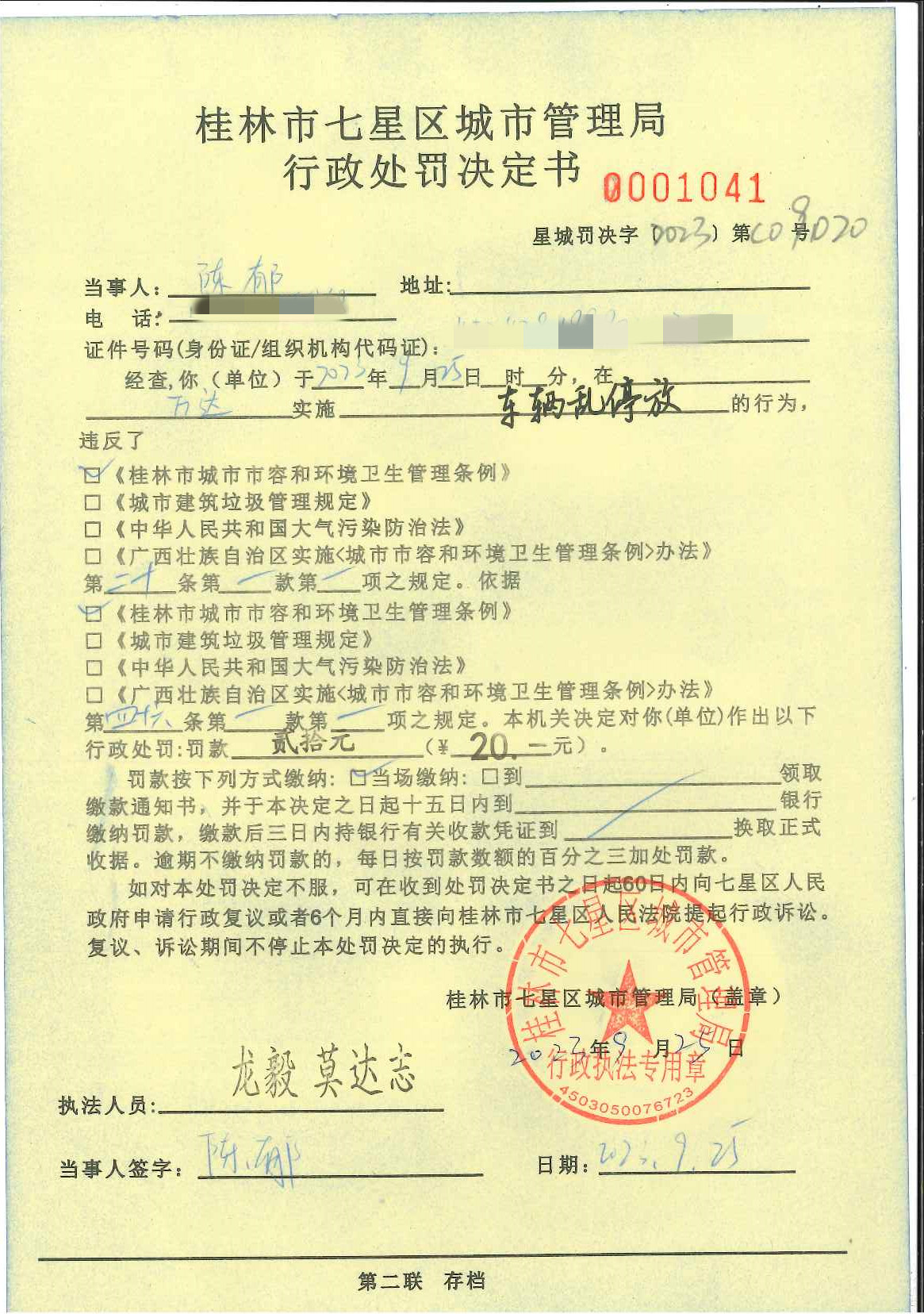 桂林市七星区城市管理局行政处罚决定书星城罚决字〔2023〕第C009020号-陈郁