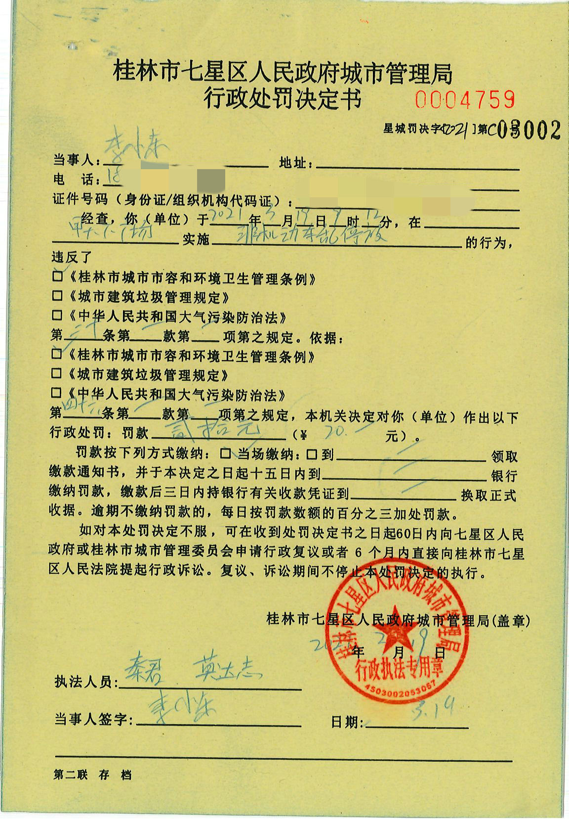 桂林市七星区城市管理局行政处罚决定书星城罚决字〔2021〕C03002号-李小东