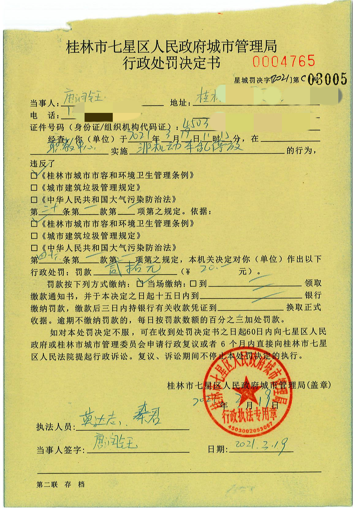 桂林市七星区城市管理局行政处罚决定书星城罚决字〔2021〕C03005号-唐润钰