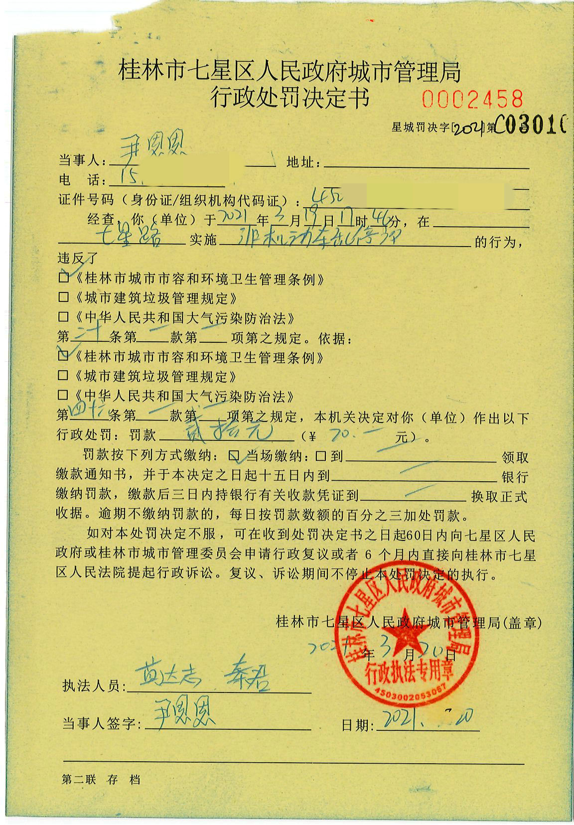桂林市七星区城市管理局行政处罚决定书星城罚决字〔2021〕C03010号-尹思思