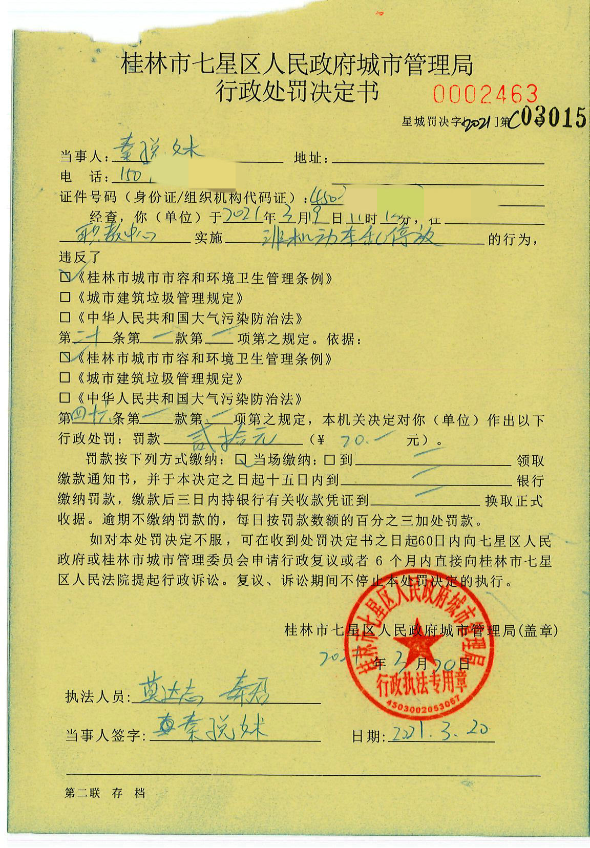 桂林市七星区城市管理局行政处罚决定书星城罚决字〔2021〕C03015号-秦子兑妹
