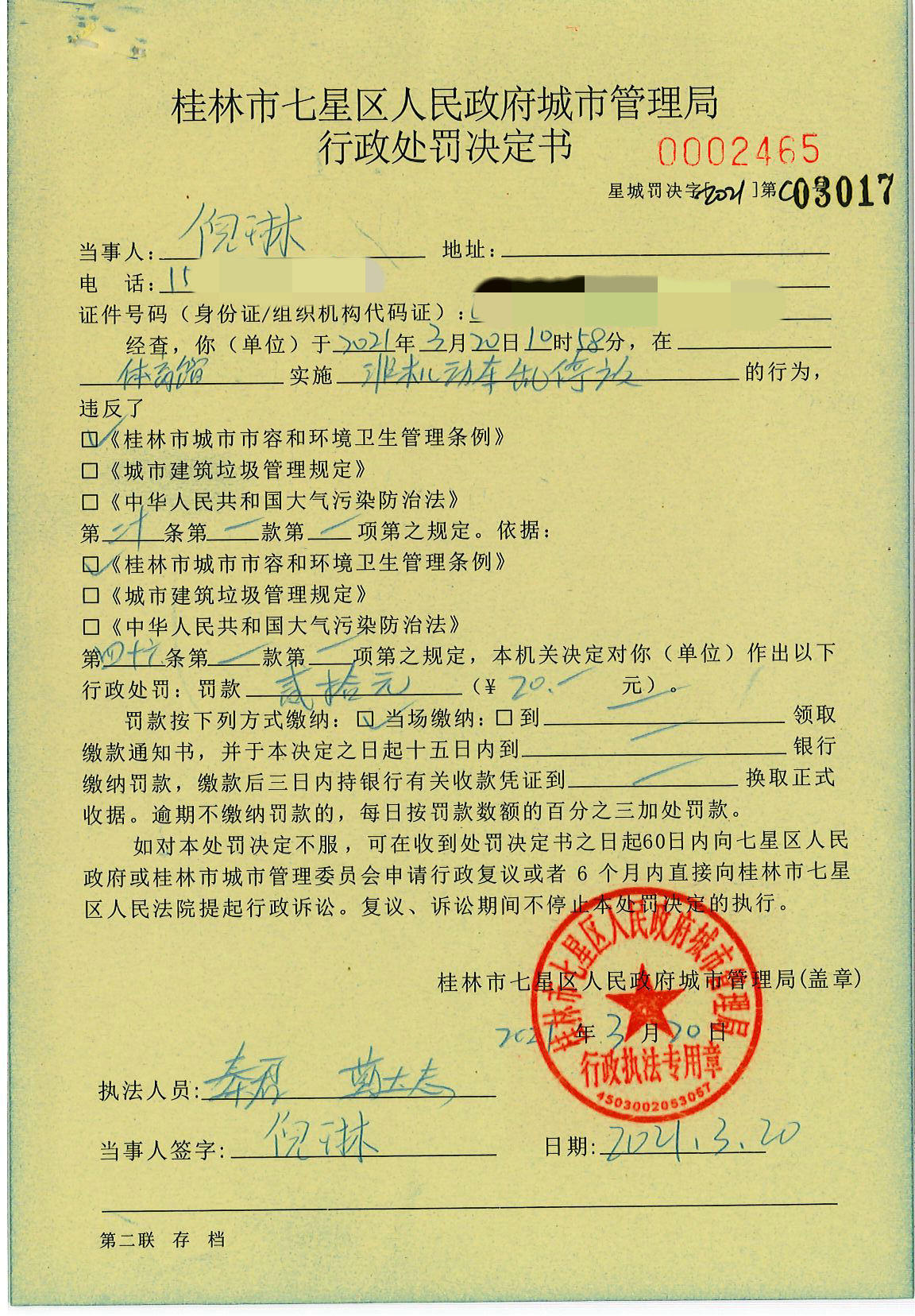 桂林市七星区城市管理局行政处罚决定书星城罚决字〔2021〕C03017号-倪琳