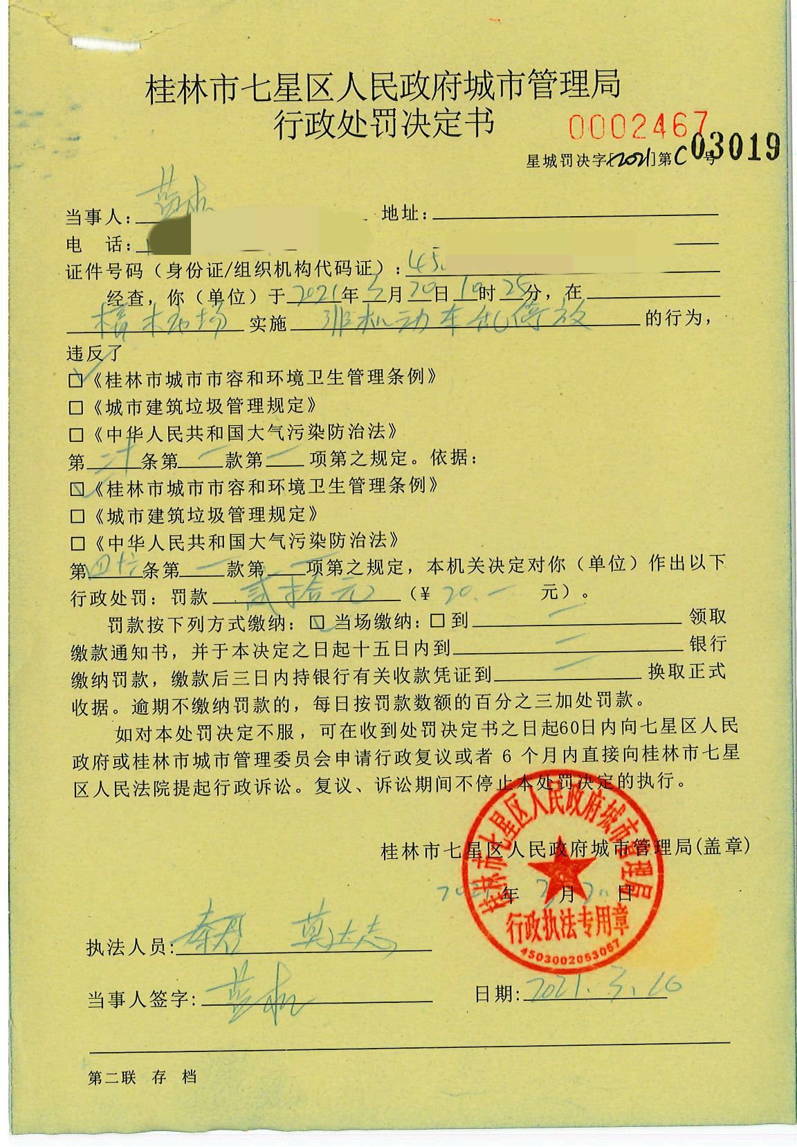 桂林市七星区城市管理局行政处罚决定书星城罚决字〔2021〕C03019号-蓝机