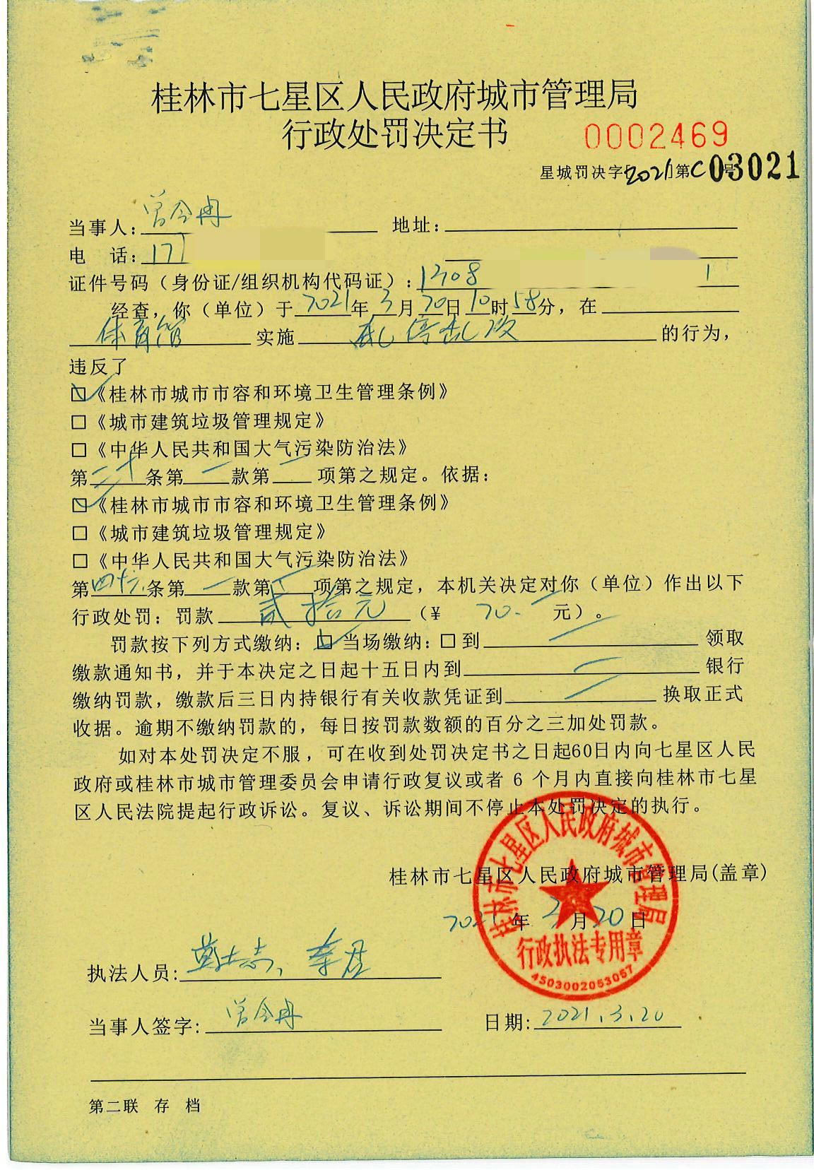 桂林市七星区城市管理局行政处罚决定书星城罚决字〔2021〕C03021号-曾令冉