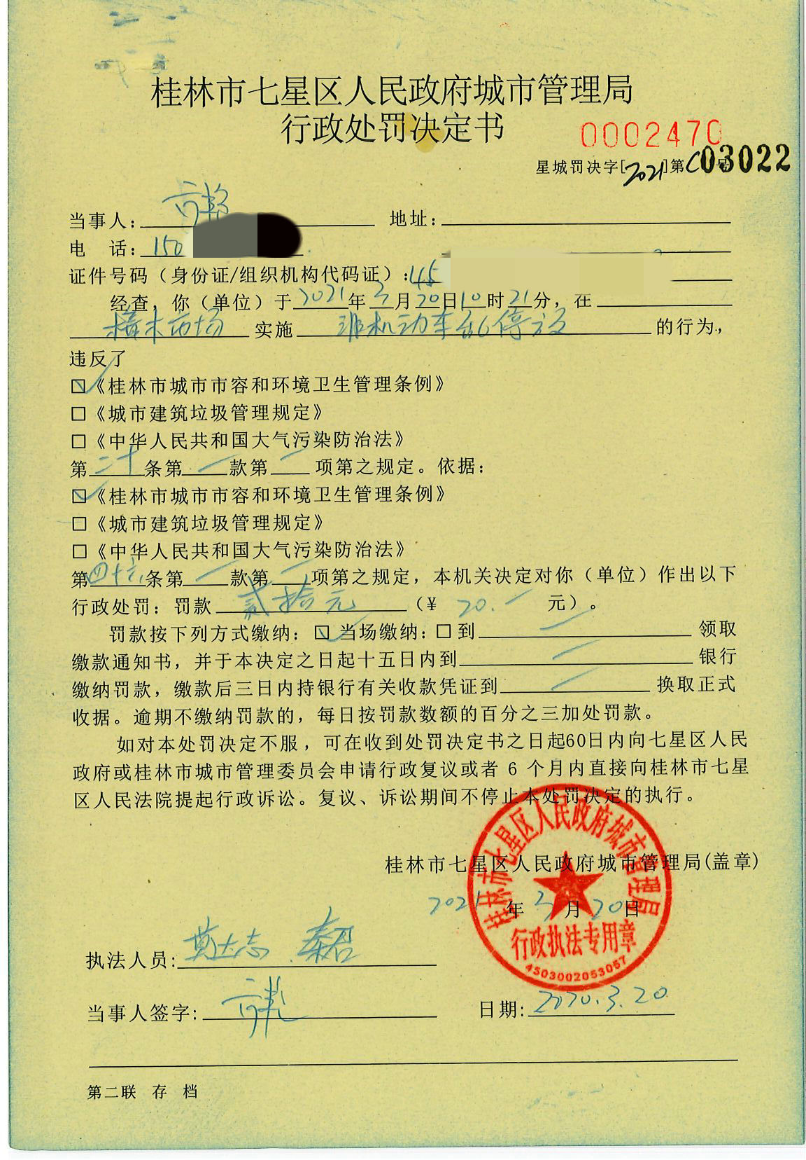 桂林市七星区城市管理局行政处罚决定书星城罚决字〔2021〕C03022号-方艳