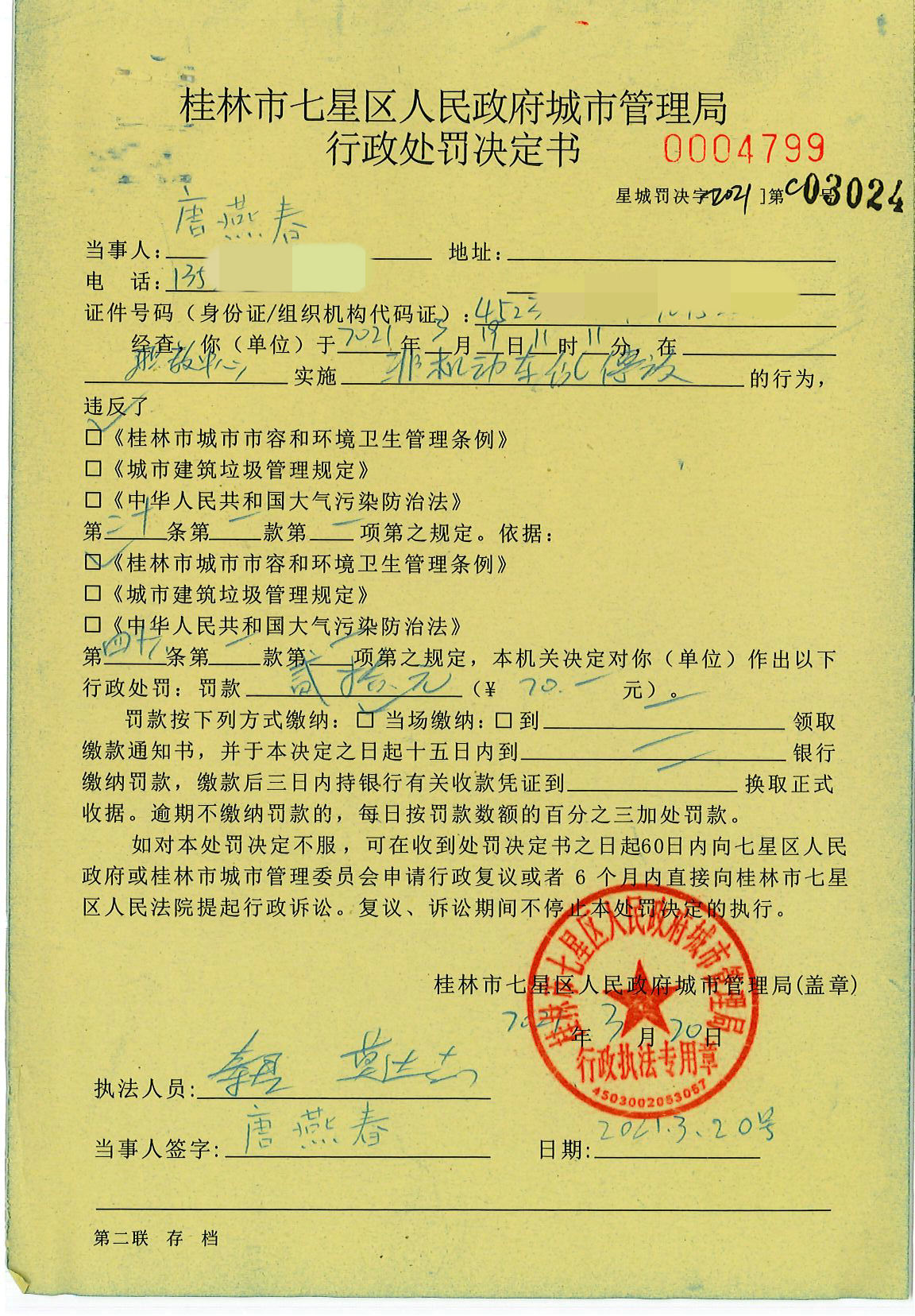 桂林市七星区城市管理局行政处罚决定书星城罚决字〔2021〕C03024号-唐燕春