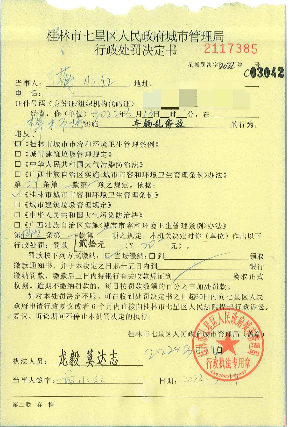 桂林市七星区城市管理局行政处罚决定书星城罚决字〔2022〕第C03042号-蒋小红