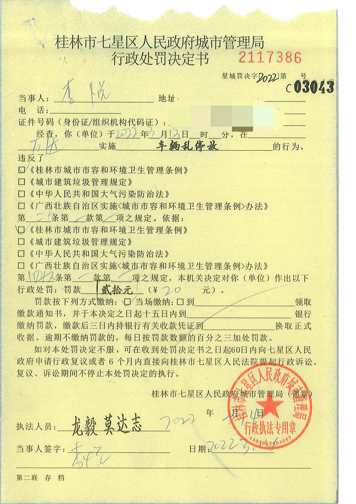 桂林市七星区城市管理局行政处罚决定书星城罚决字〔2022〕第C03043号-李悦
