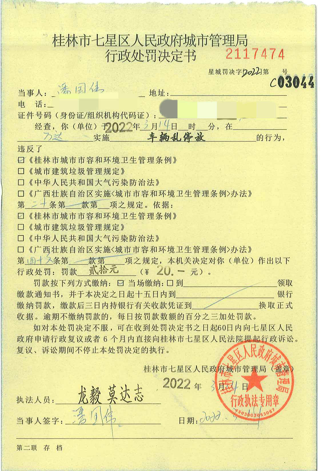 桂林市七星区城市管理局行政处罚决定书星城罚决字〔2022〕第C03044号-潘国伟