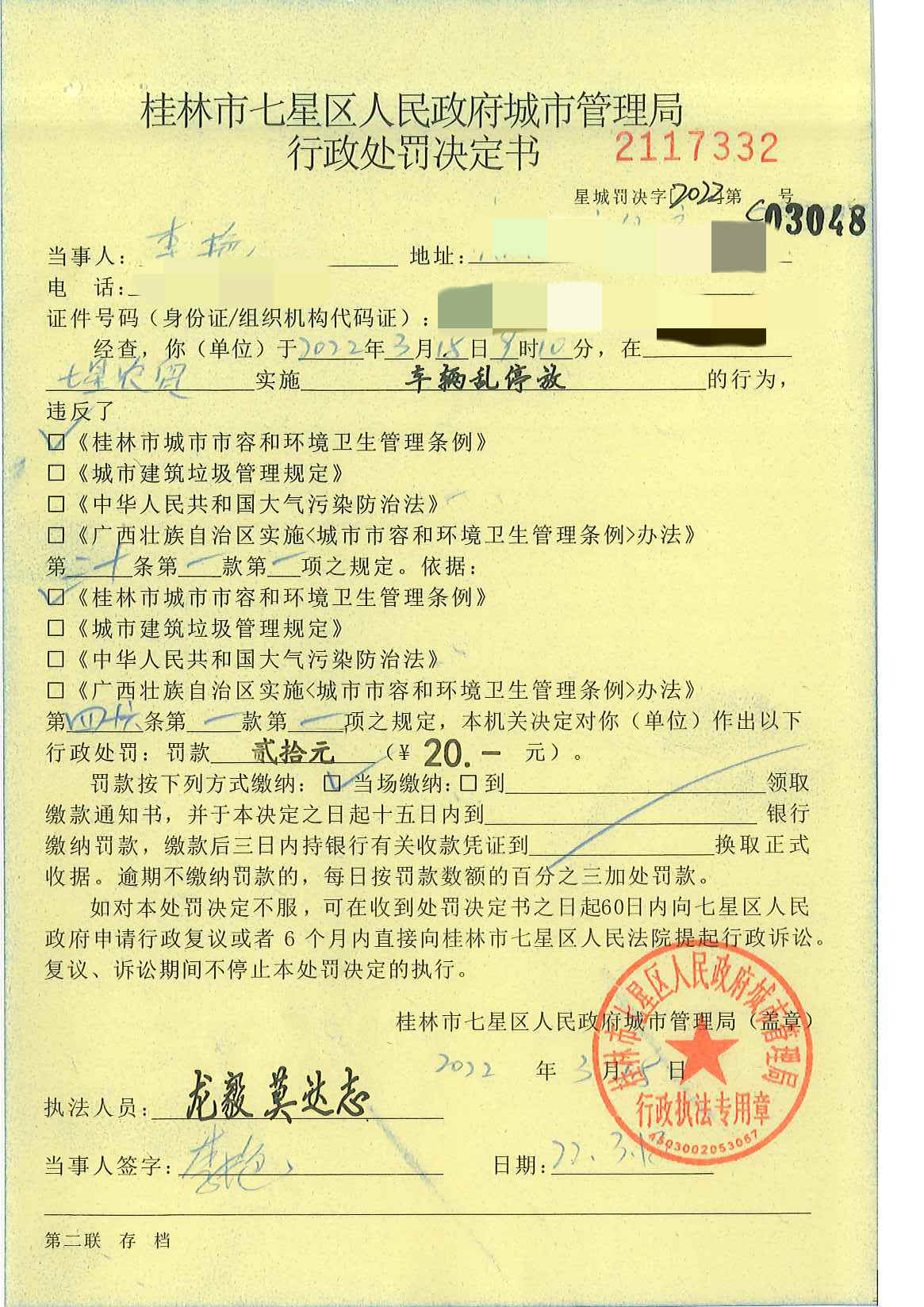 桂林市七星区城市管理局行政处罚决定书星城罚决字〔2022〕第C03048号-李艳