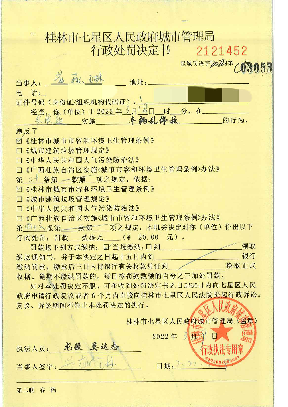 桂林市七星区城市管理局行政处罚决定书星城罚决字〔2022〕第C03053号-黄燕琳