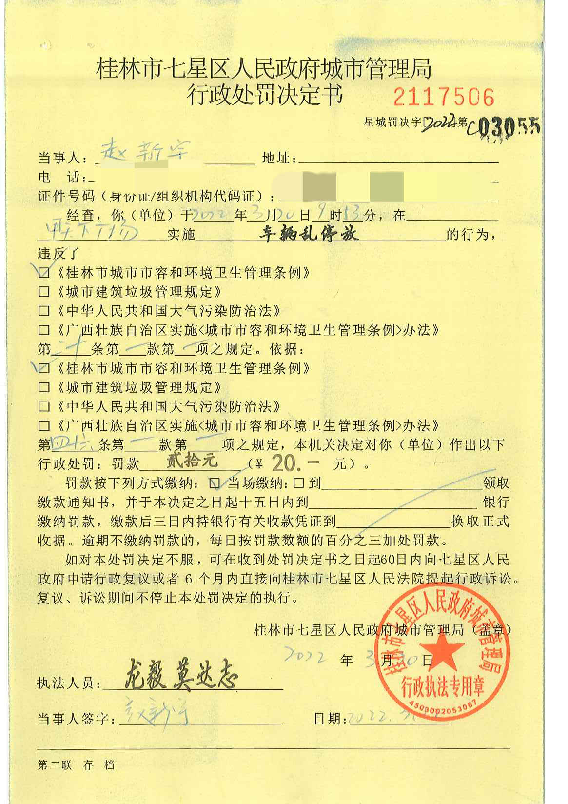 桂林市七星区城市管理局行政处罚决定书星城罚决字〔2022〕第C03055号-赵新宇