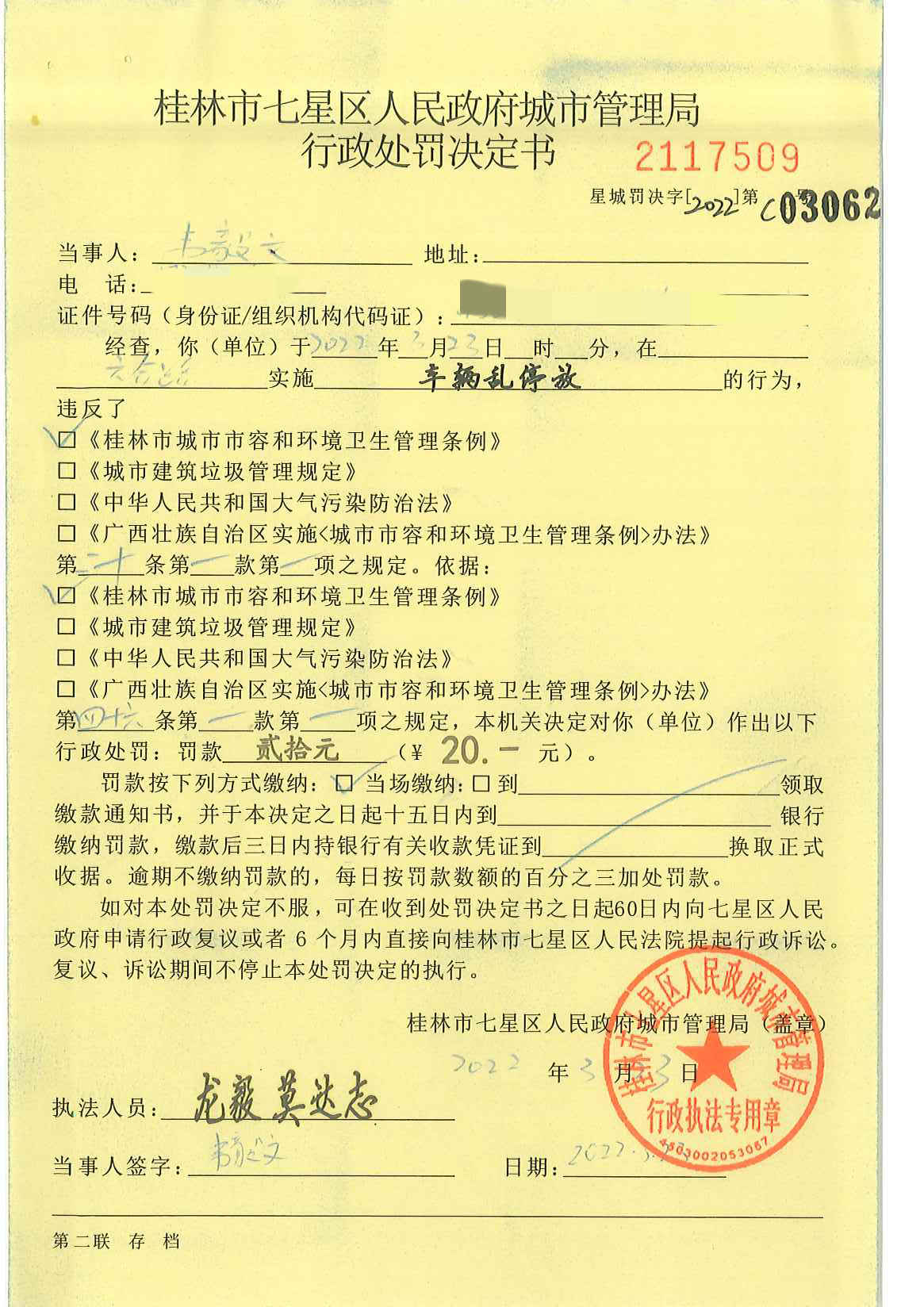 桂林市七星区城市管理局行政处罚决定书星城罚决字〔2022〕第C03062号-韦毅文