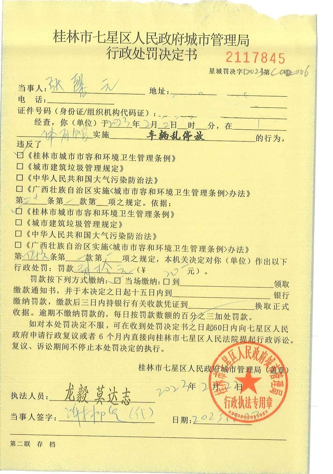 桂林市七星区城市管理局行政处罚决定书星城罚决字〔2023〕第C02006号-张馨元