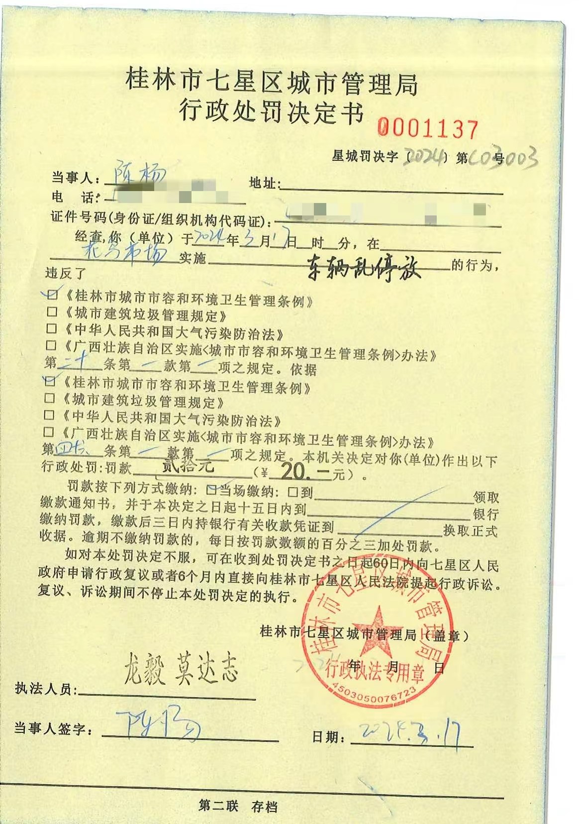 桂林市七星区城市管理局行政处罚决定书星城罚决字〔2024〕第C03003号陈杨