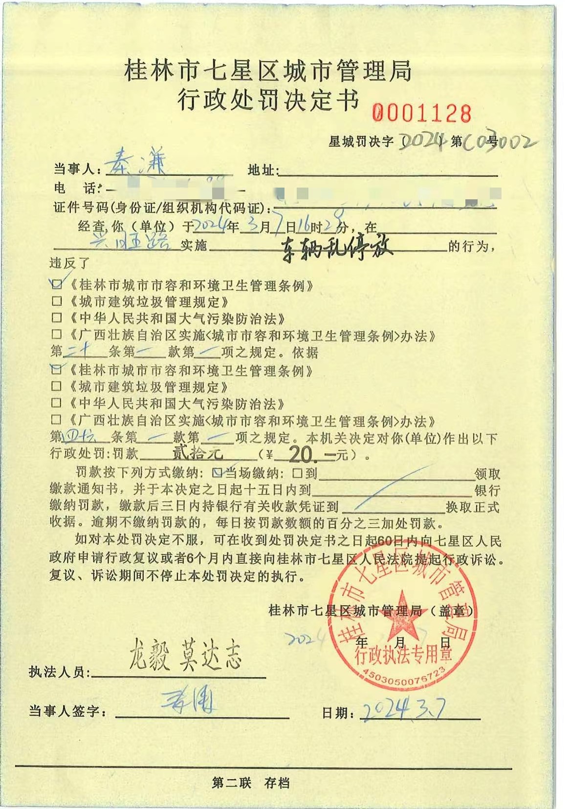 桂林市七星区城市管理局行政处罚决定书星城罚决字〔2024〕第C03002号秦谦