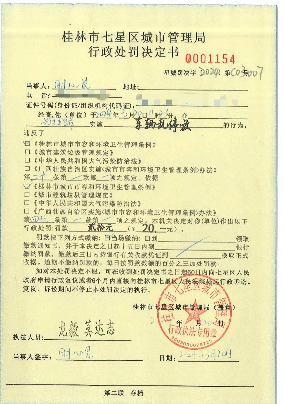 桂林市七星区城市管理局行政处罚决定书星城罚决字〔2024〕第C03007号时心晨