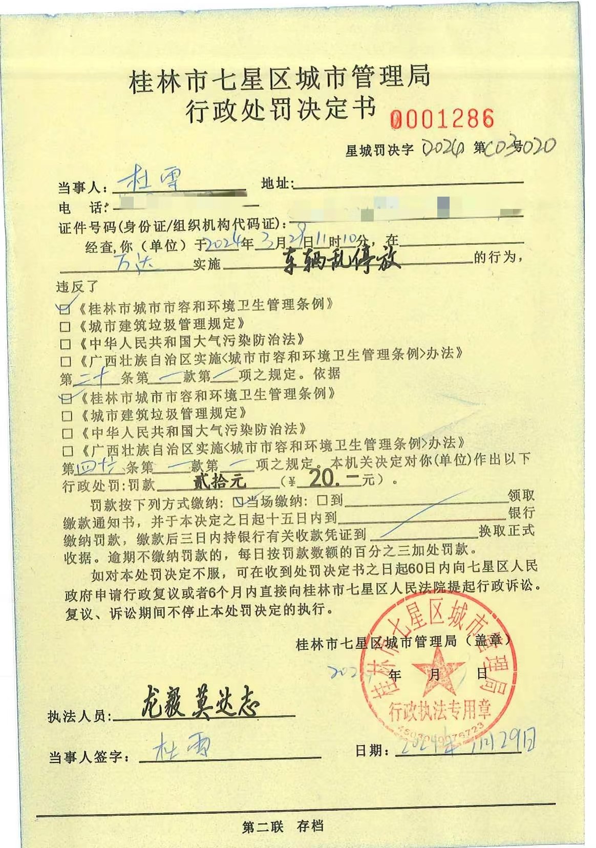 桂林市七星区城市管理局行政处罚决定书星城罚决字〔2024〕第C03020号杜雪