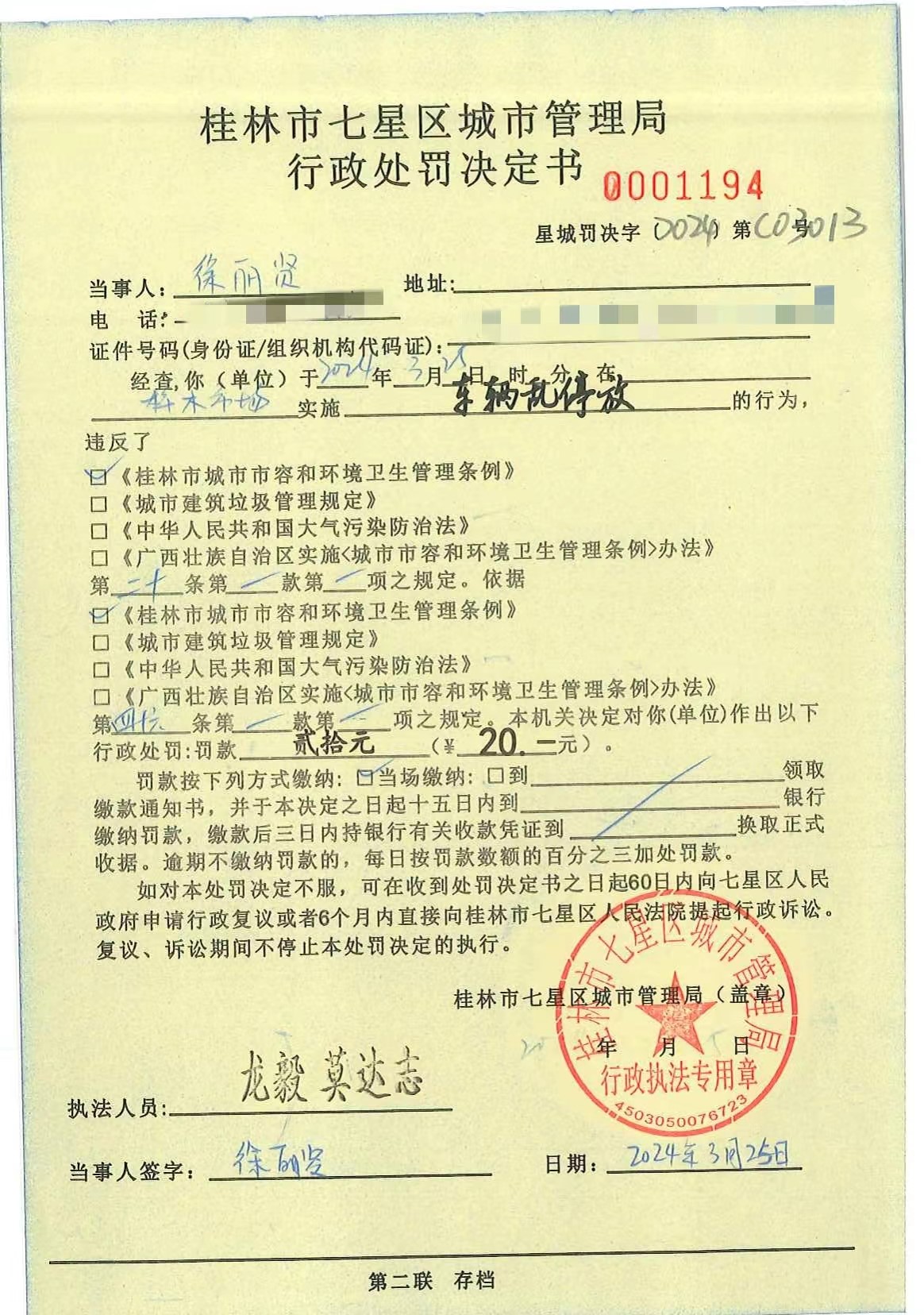 桂林市七星区城市管理局行政处罚决定书星城罚决字〔2024〕第C03013号徐丽贤