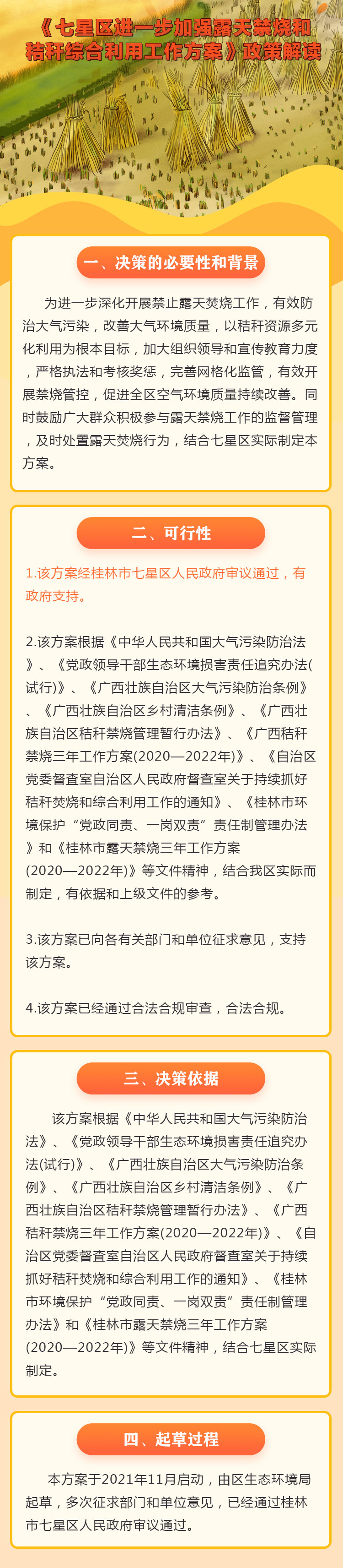 该方案根据《中华人民共和国大气污染防治法》、《党政领导干部生态环境损害责任追究办法(试行)》、《广西壮族自治区大气污染防治条例》、《广西壮族自治区乡村清洁条例》、《广西壮族自治区秸秆禁烧管理暂行办法》、《广西秸秆禁烧三年工作方案(2020—2022年)》、《自治区党委督查室自治区人民政府督查室关于持续抓好秸秆焚烧和综合利用工作的通知》、《桂林市环境保护“党政同责、一岗双责”责任制管理办法》和《桂林市露天禁烧三年工作方案(2020—2022年)》等文件精神,结合七星区实际制定。