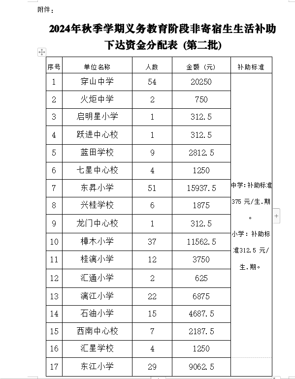 根据自治区财政厅、教育厅《关于提前下达2024年城乡义务教育中央和自治区补助经费预算的通知》(桂财教〔2023〕136号)文件精神,参照《广西壮族自治区城乡义务教育补助经费管理办法的通知》(桂财教〔2023〕3号)和《自治区教育厅自治区财政厅关于进一步做好义务教育阶段家庭经济困难学生生活补助工作的通知》(桂教资助〔2023〕11号)、《 广西壮族自治区教育厅等八部门关于印发广西壮族自治区家庭经济困难学生认定实施办法的通知》(桂教规范〔2023〕16号),我局按照各学校核实上报的人数,确定了2024年秋季学期第二批义务教育阶段家庭经济困难非寄宿生生活补助人数、资金。本次下达资金总计9.44375万元,涉及学校21所,享受义务教育阶段家庭经济困难非寄宿生生活补助291人,发放分配指标详见附件。请各学校认真做好义务教育阶段家庭经济困难非寄宿生的申请、审核和公示工作,确保资金发放各个环节公开、公平、公正。具体操作流程按资助中心下发的《关于开展义务教育阶段家庭经济困难非寄宿生生活补助的通知》执行。