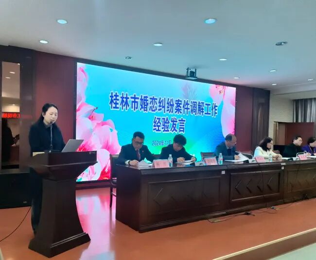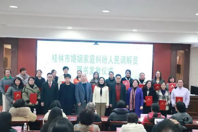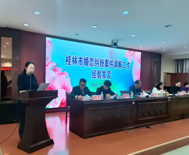 会上,七星区法院、灵川县妇联、全州县妇联、七星区妇联作经验介绍。市婚调委主任黄丽娟对县区婚调工作进行了亮点分析,并对全市婚调工作进行总结,部署明年工作任务。会议现场为20名新聘市婚调员颁发聘书,同时公布了2025年桂林市婚姻家庭纠纷案件调解“以案定补”经费试行办法。会议组织参会人员实地参观七星区法院家事审判法庭、未成年人保护巾帼岗、七星区婚调委,现场参观点温馨别致,彰显司法柔情,得到与会人员高度赞扬。