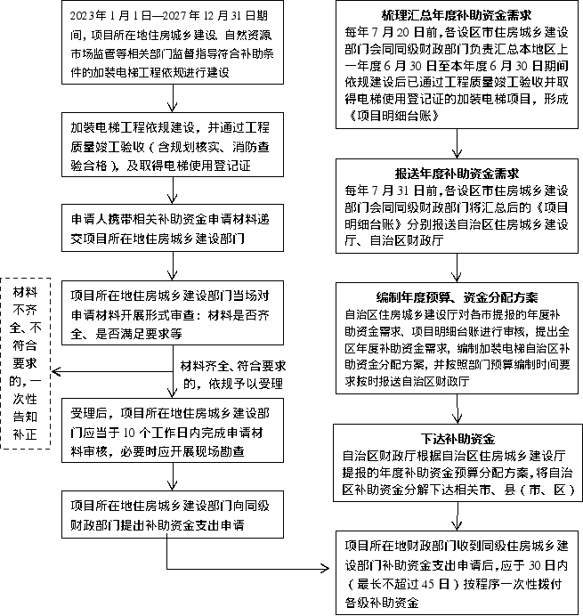第十二条 报送年度补助资金需求。每年7月20日前,各设区市住房城乡建设部门应当会同同级财政部门梳理汇总本市及所辖县(市、区)上一年度6月30日至当年度6月30日期间工程质量竣工验收合格(含规划核实、消防查验合格)并取得电梯使用登记证的符合补助条件的加装电梯项目,形成项目明细台账,填写《既有住宅加装电梯项目明细表》,于每年7月31日前分别报送至自治区住房城乡建设厅、自治区财政厅(政策执行的最后一年的报送时间视情况调整)。