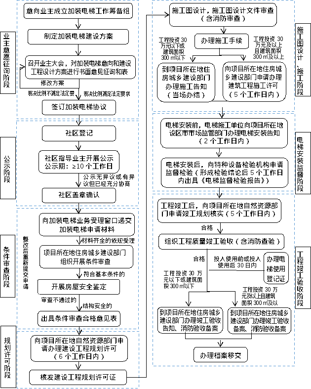 (四)加装申请及条件审查。申请人依规完成意愿征询、社区登记、方案公示等各项前期工作并经社区盖章确认后,可向项目所在地住房城乡建设部门提出加装电梯申请。