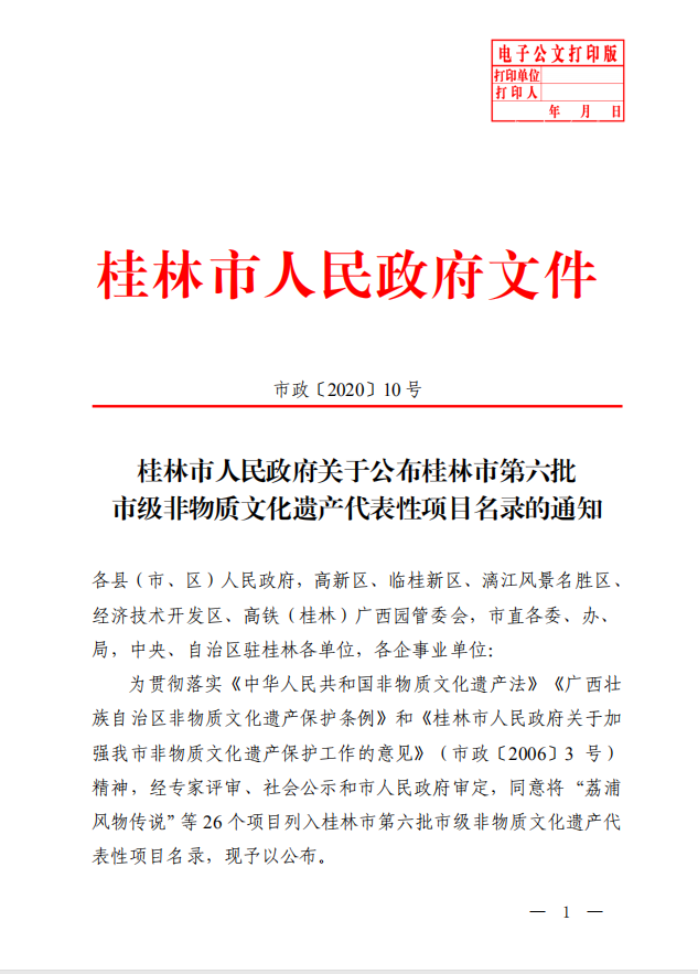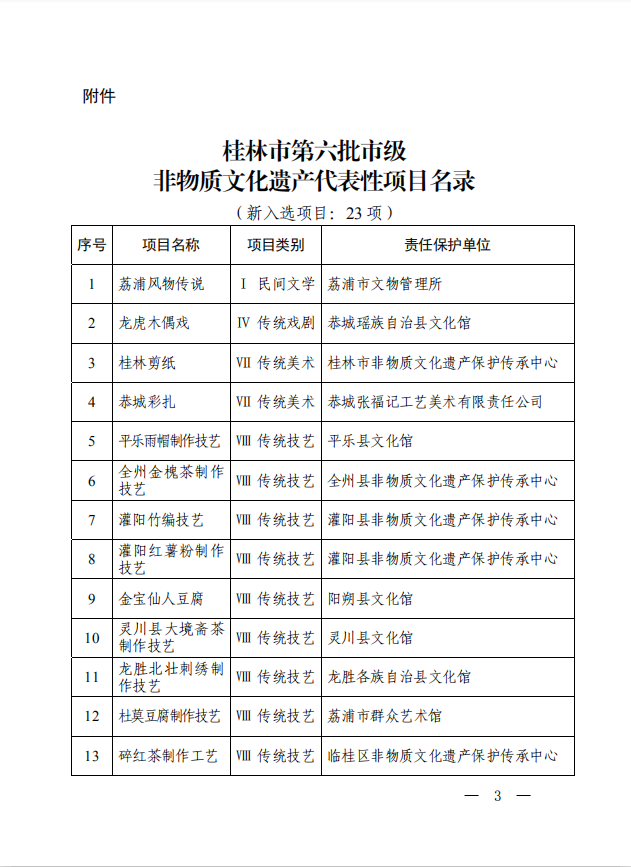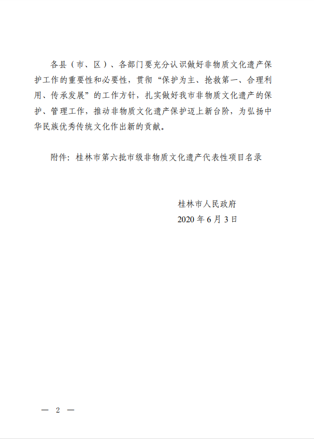 桂林市人民政府关于公布桂林市第六批市级非物质文化遗产代表性项目名录的通知