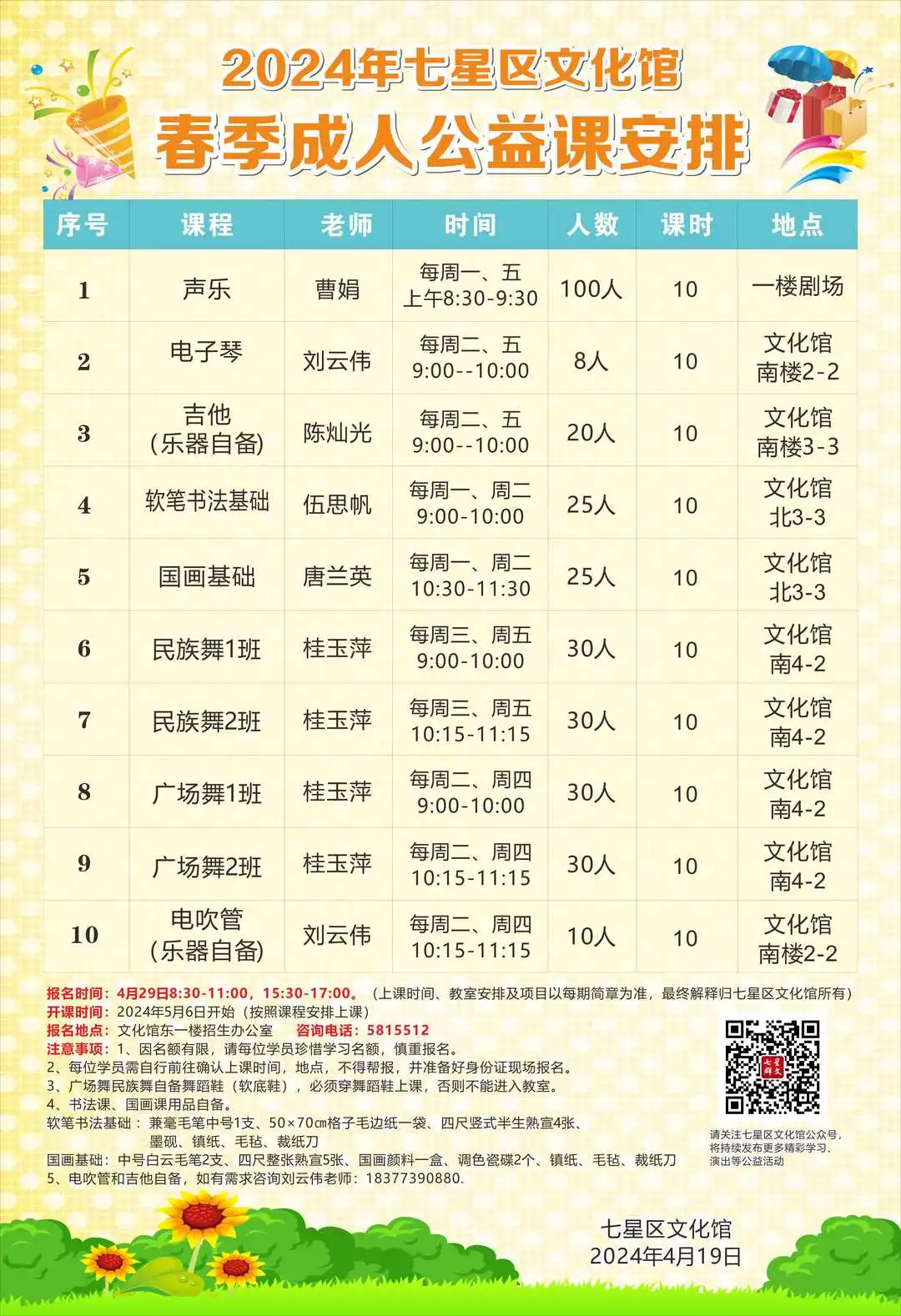 为构建现代公共文化服务体系,繁荣我区文化艺术事业,加快推动群众文化建设,提高全民艺术素质,陶冶全民艺术情操,丰富群众文化生活,七星区文化馆2024年春季公益培训班开班啦,具体课程安排如下: