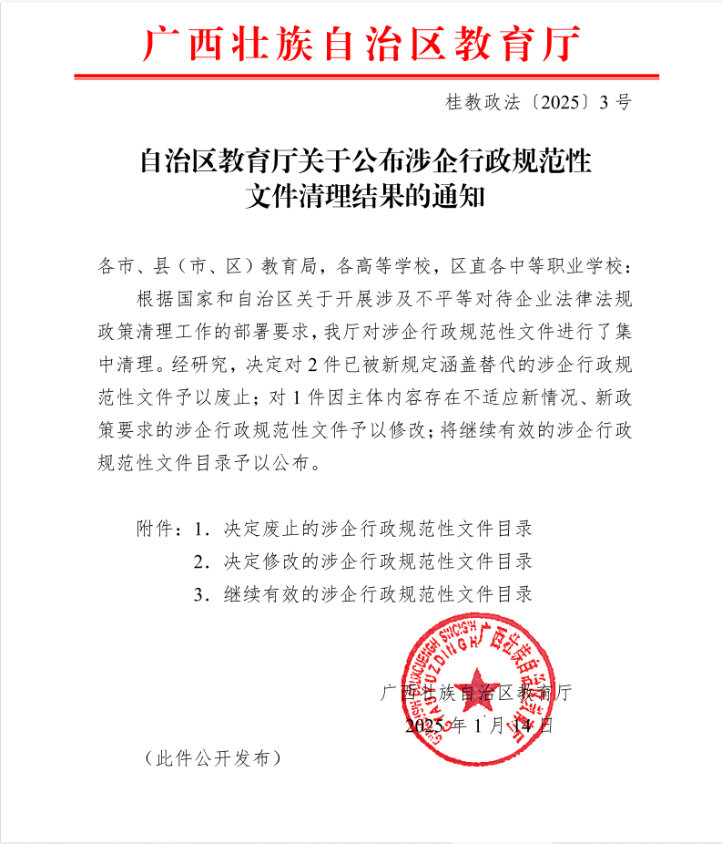 桂教政法〔2025〕3号自治区教育厅关于公布涉企行政规范性文件清理结果的通知