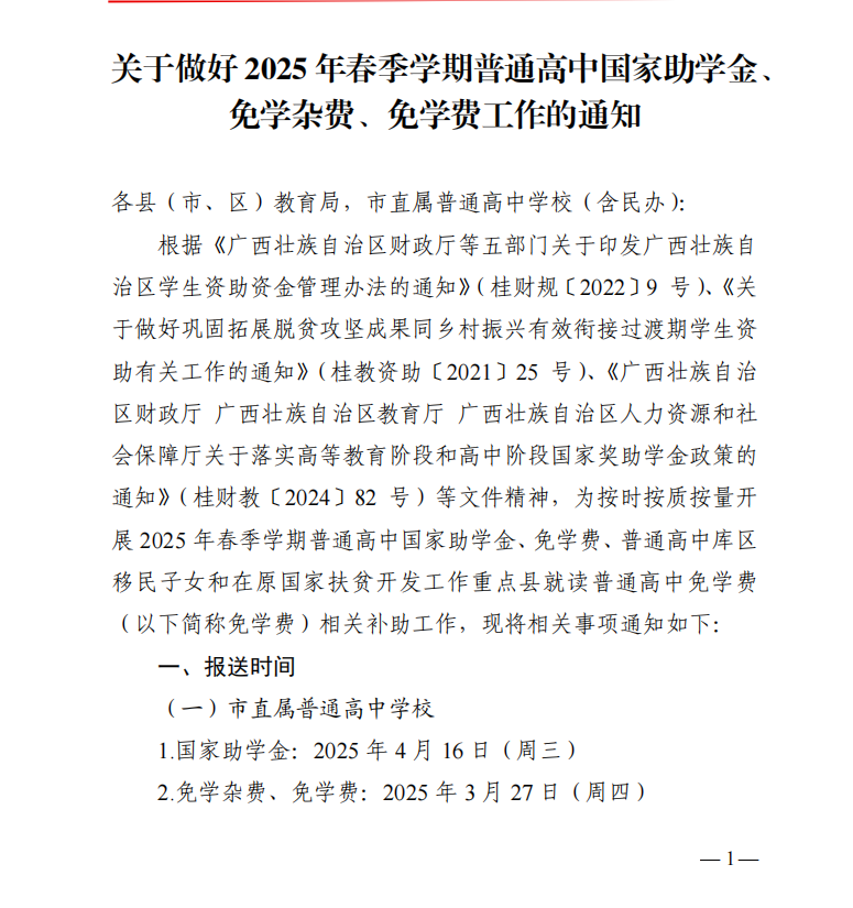 关于做好2025年春季学期普通高中国家助学金、免学杂费、免学费工作的通知