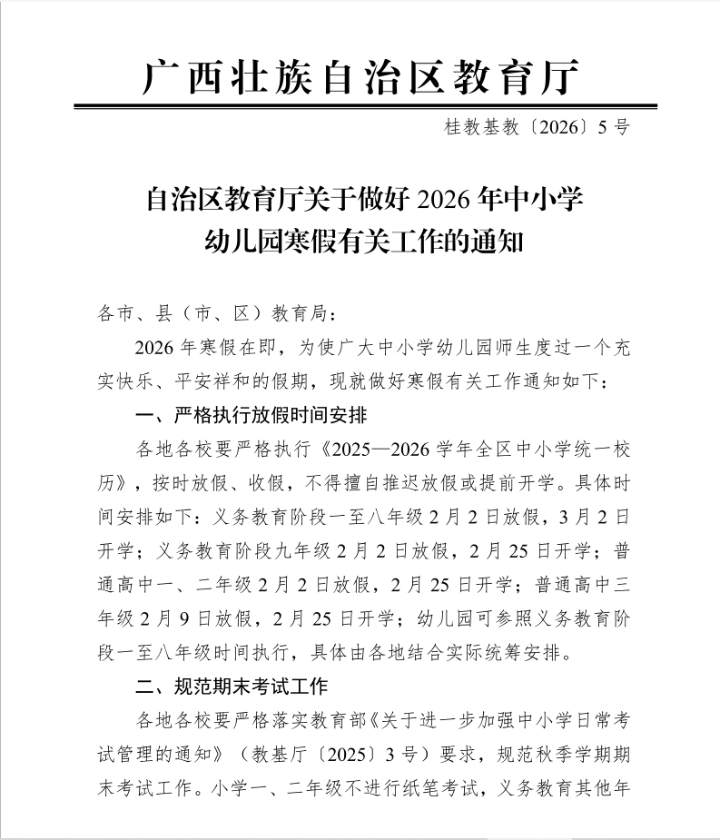 自治区教育厅关于做好2026年中小学幼儿园寒假有关工作的通知