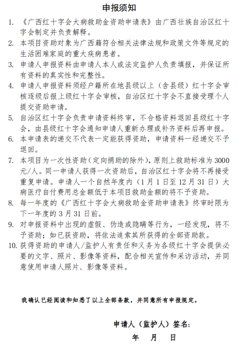 (二)申请人填写《广西红十字会大病救助金资助申请表》(详见附件2),并提交相关证明资料。