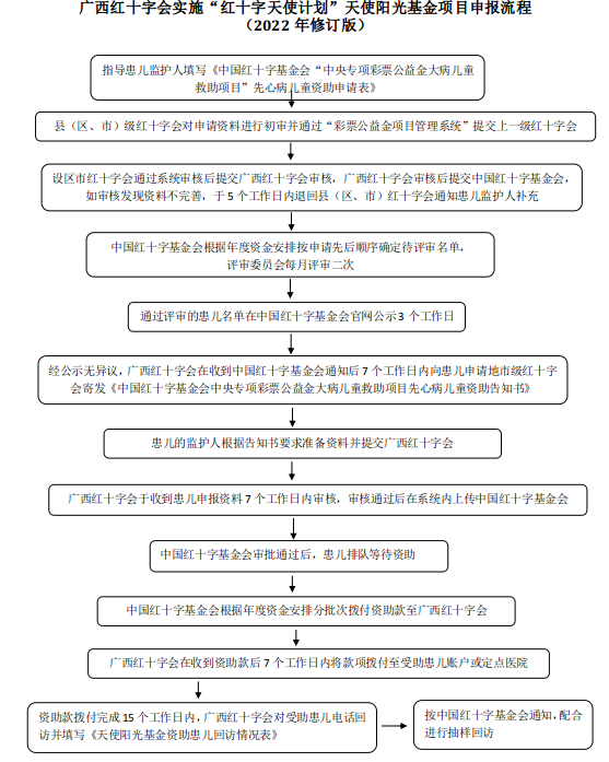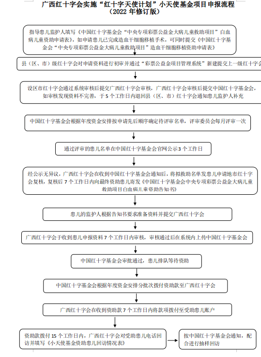 根据实际工作需求及中国红十字基金会相关项目申报流程调整,经会党组审定,现将《广西壮族自治区红十字会大病救助金管理办法(2022年修订版)》《广西红十字会实施“红十字天使计划”天使阳光基金项目申报流程(2022年修订版)》《广西红十字会实施“红十字天使计划”小天使基金项目申报流程(2022年修订版)》印发给你们,请认真遵照执行。