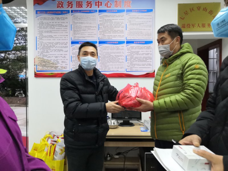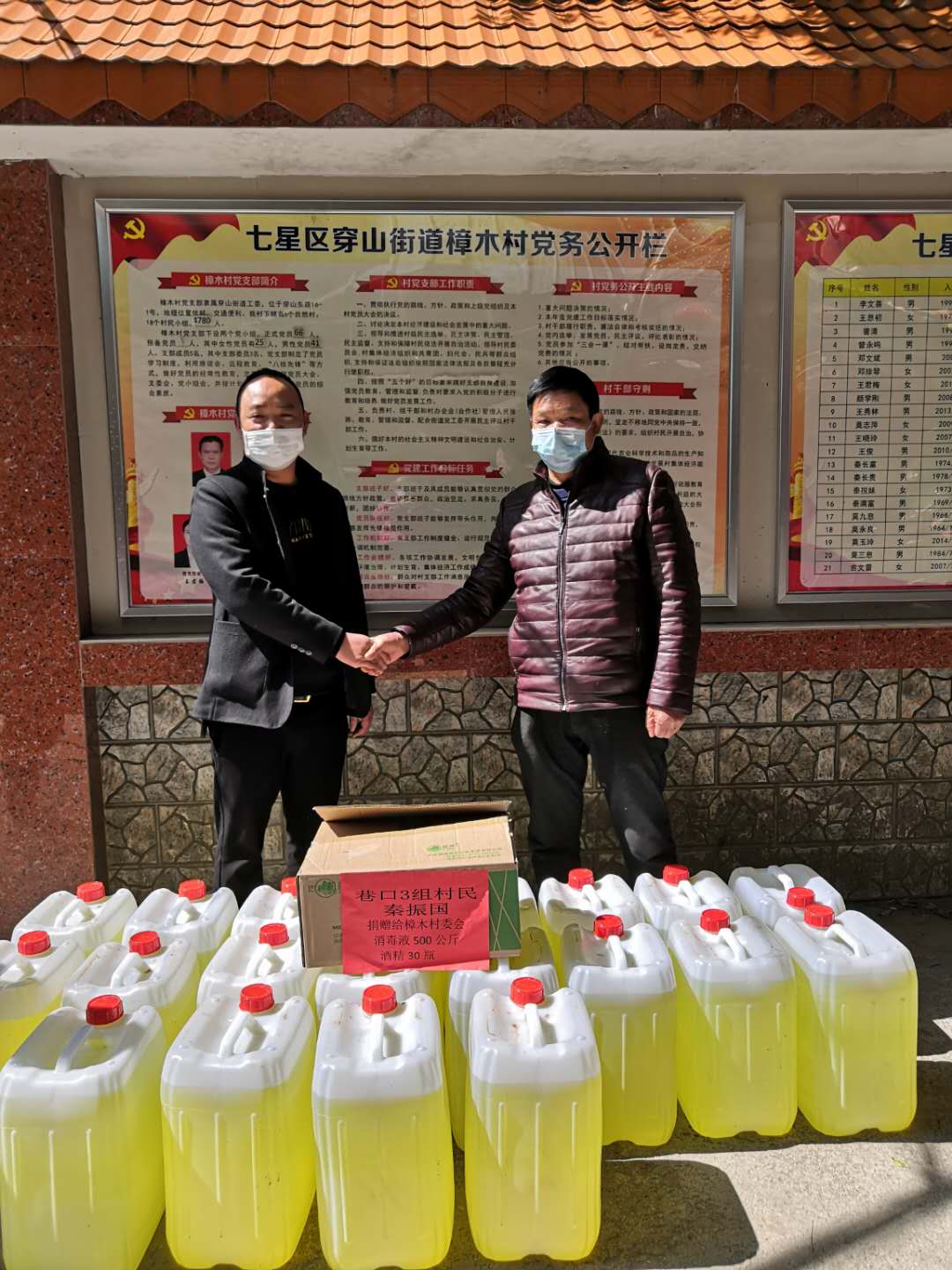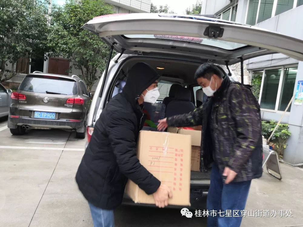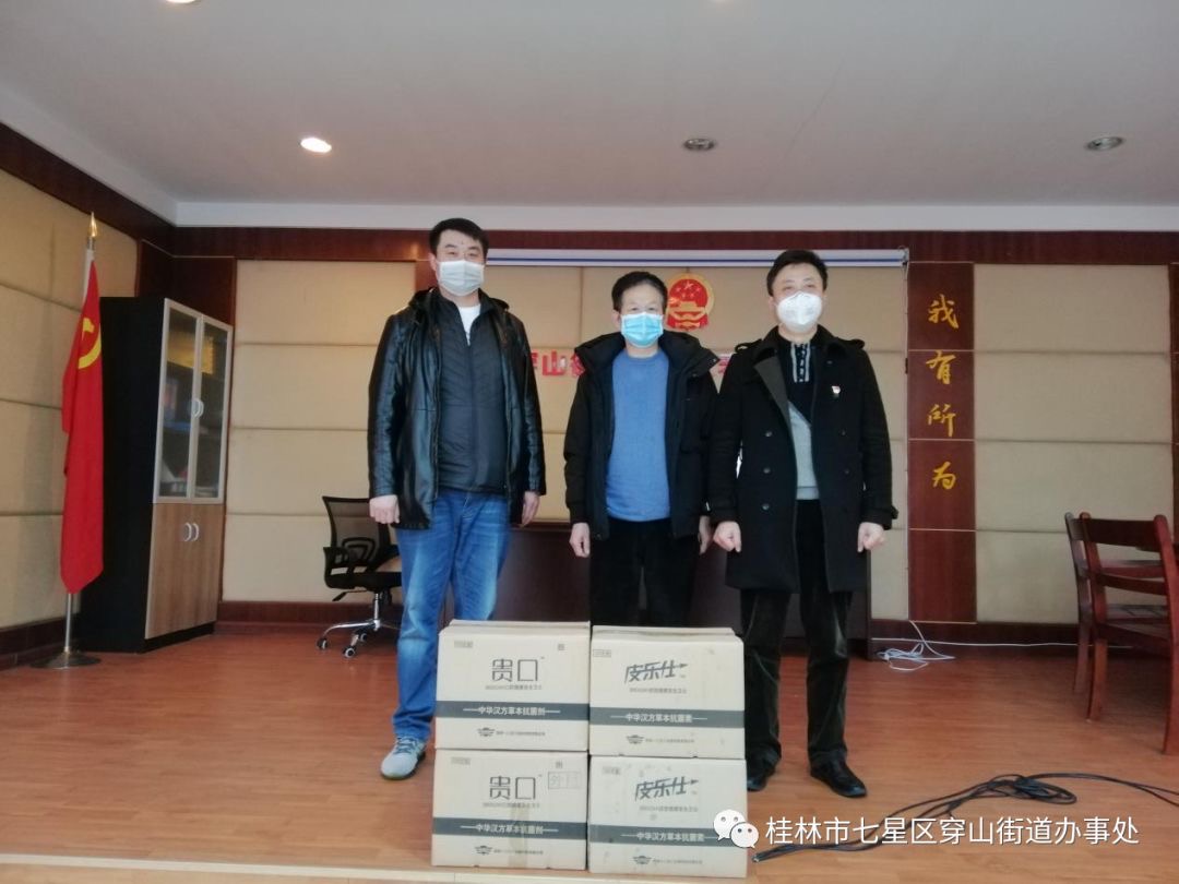 2月7日,穿山街道热心村民秦振国为樟木村委送来500公斤84消毒液,2月17日,秦振国再次向樟木村委会捐赠了500公斤84消毒液、30瓶医用酒精、300个医用口罩,此举给战斗在防疫前线的工作人员送上一丝温暖。同日上午,七星区副区长阳明冒雨驱车为穿山街道疫情防控指挥部送来中医院特制的预防感染中药包,为疫情当前一线工作人员送来了温暖于与关怀;穿山街道收到辖区穿山村委捐赠的爱心口罩1000只,为疫情防控基层一线工作人员和志愿者、乡村振兴队员开展疫情防控宣传工作做好防护提供有力保障……