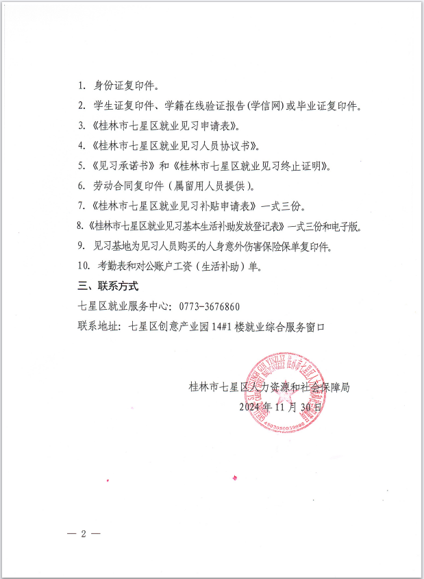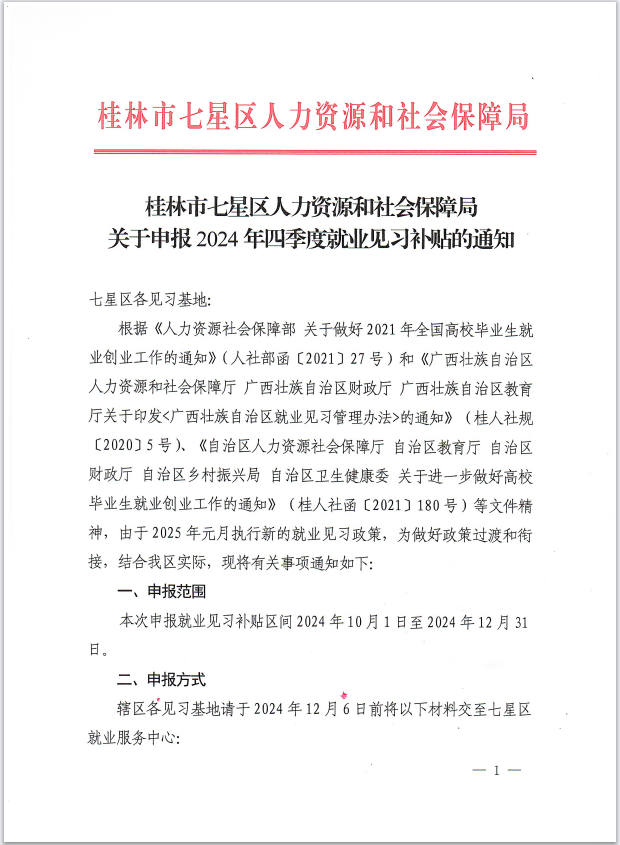 桂林市七星区人力资源和社会保障局关于申报2024年第四季度就业见习补贴的通知