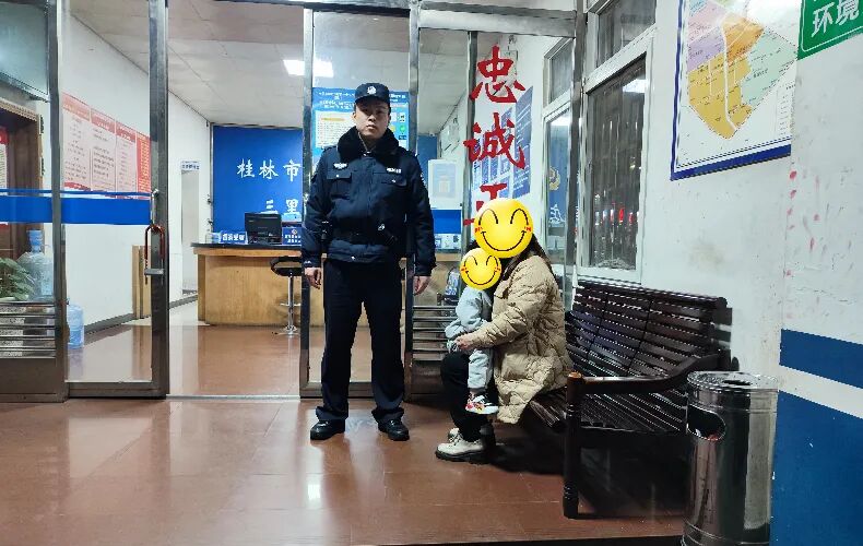 2023年12月31日18时许,桂林市公安局七星分局三里店派出所接到群众杨师傅报警求助称,在某商场门口发现一名走失小孩,因无法找到其家长,希望民警能到现场予以帮助。