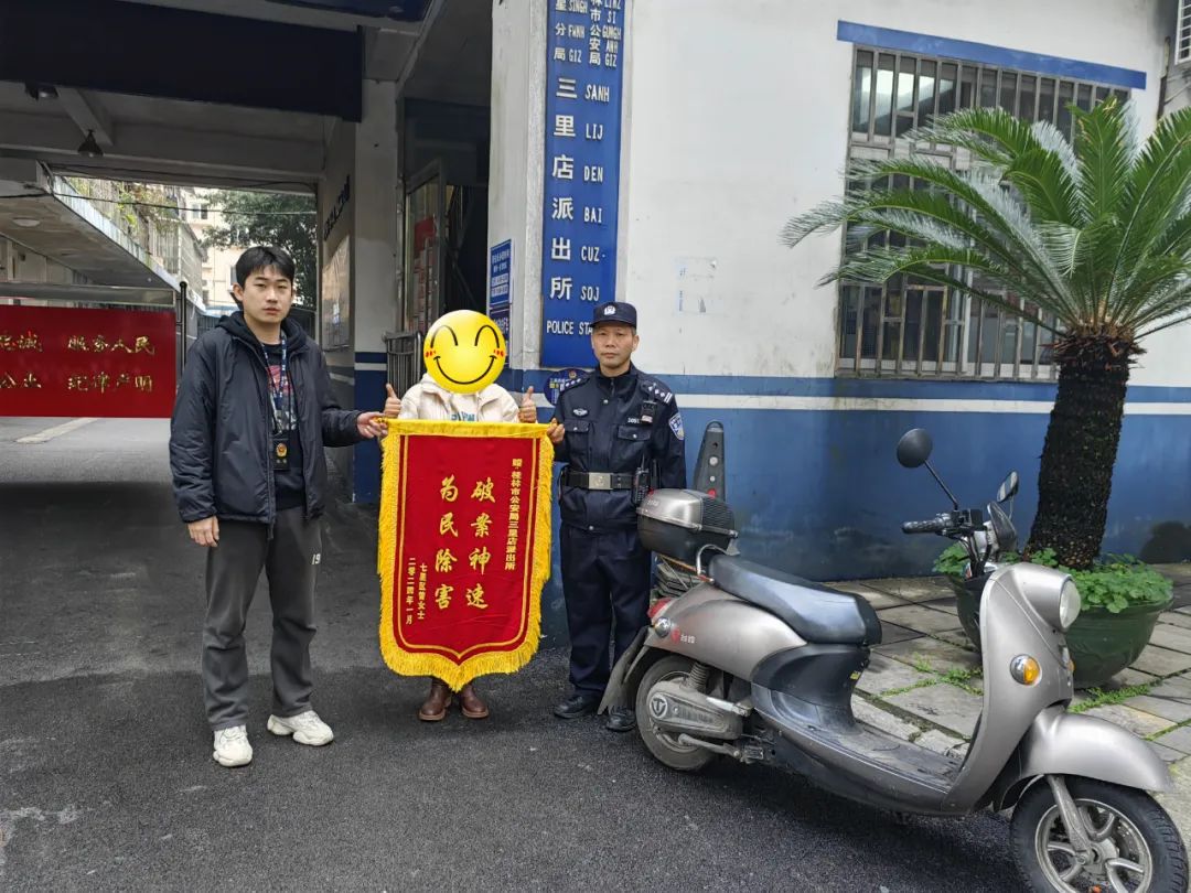 “谢谢三里店派出所的潘警官,非常快速地为我找回被盗的电动车,这是我的一份心意,这面锦旗请你们一定要收下!”2024年1月15日下午,群众曾女士带着一面印有“破案神速 为民除害”的感谢锦旗来到桂林市公安局七星分局三里店派出所,专程来所感谢办案民警为自己找回被盗电动车。