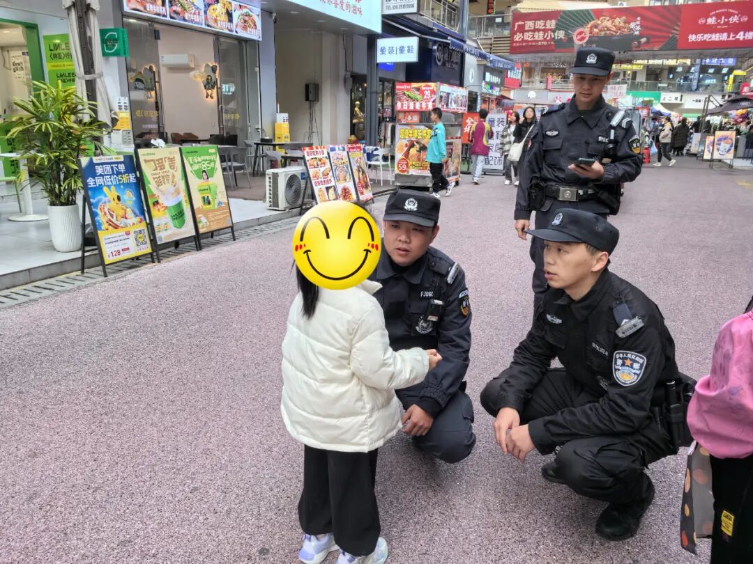 队员们一边安抚女孩的情绪,一边耐心询问女孩的家庭住址、父母姓名以及自己的姓名,但此时女孩情绪比较激动,并没问出太多有效信息。为尽快帮助女孩找到家人,赵振辉与指挥中心取得联系,告之若有家属报案寻找走失儿童的及时与警务站联系。同时,辅警带着女孩前往商场服务总台,尝试利用商场广播寻找女孩家长。