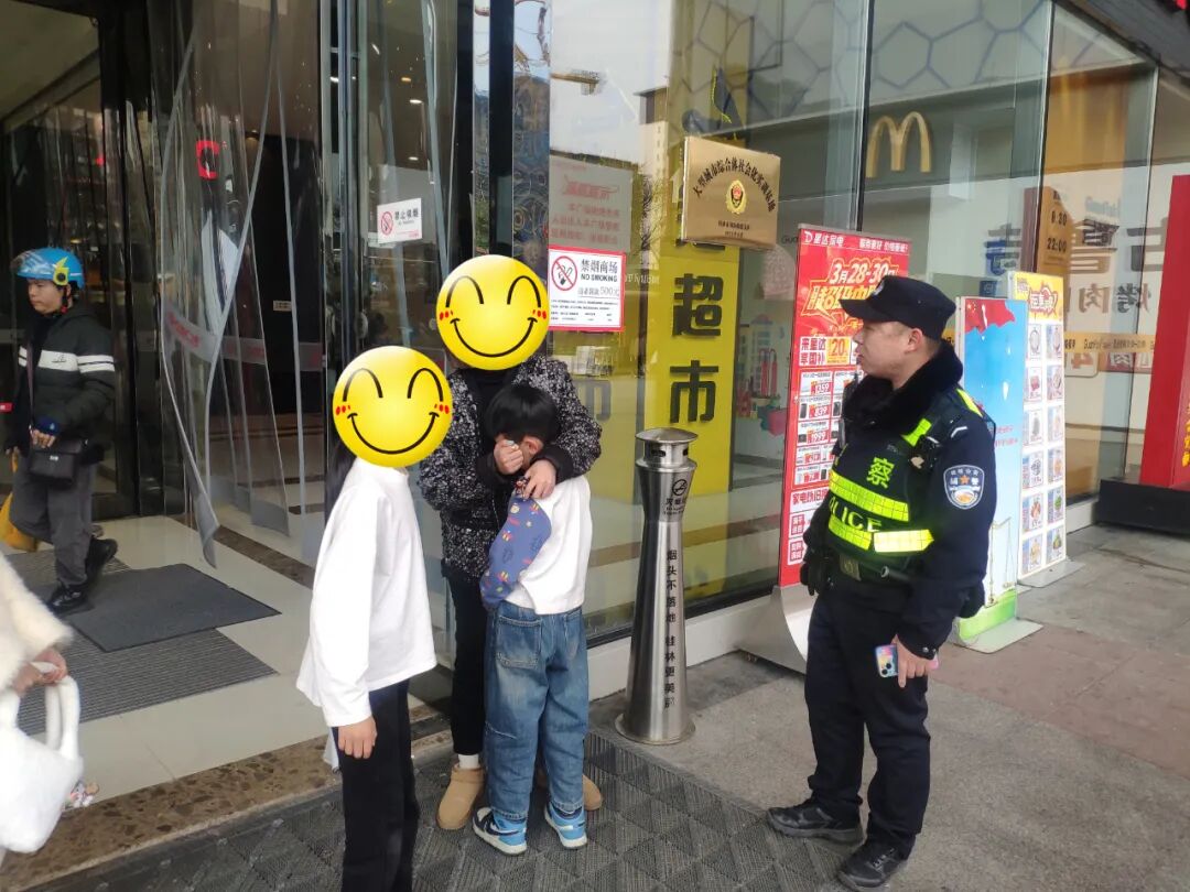 3月16日15时许,巡逻大队辅警黄能帝与队员在七星万达广场开展日常巡逻时,发现一名男童独自站在路边哭泣。经耐心安抚询问,得知6岁男孩因贪玩与母亲、姐姐走散。巡逻队员立即启动应急机制,兵分两路展开寻亲行动。
