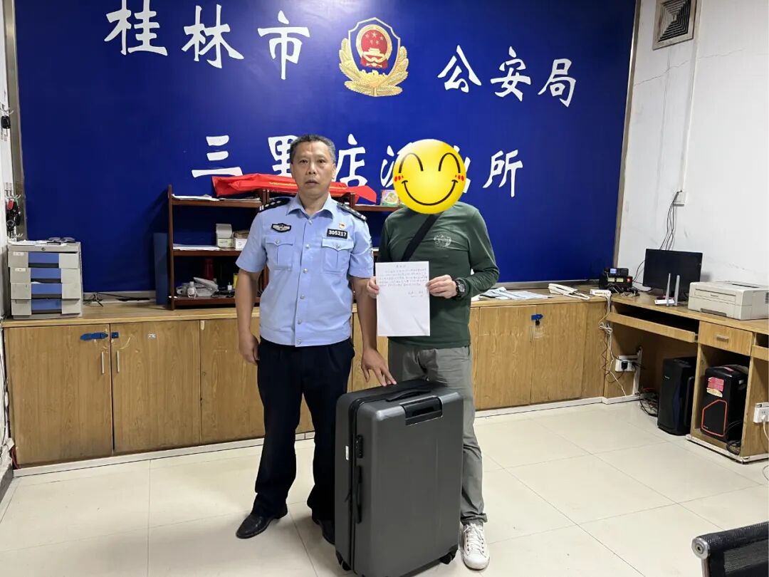 5月28日23时30分许,三里店派出所接到高先生报警求助,称其在七星区漓江路某酒店下车时,将自己的行李箱遗忘在出租车后备箱,因无法联系到司机,希望民警可以帮助寻找。