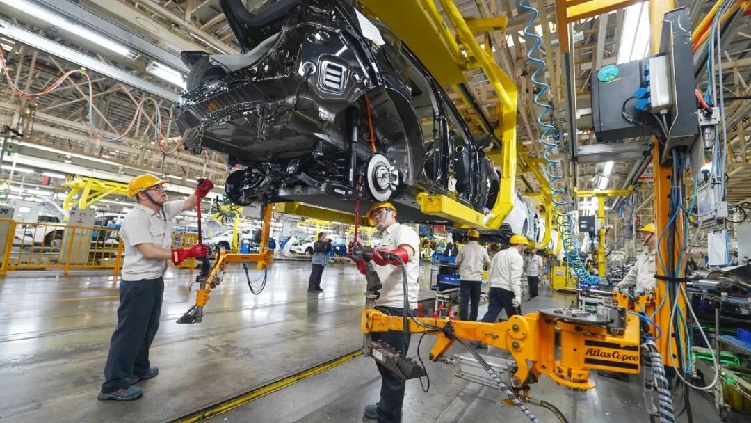 资料图片:东风柳汽乘用车生产线上,工作人员对SUV车型进行底盘总装。广西云-南国今报记者 唐绍怡 摄