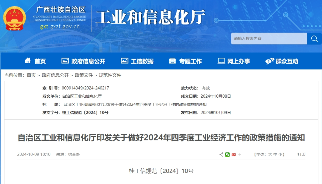 近日,广西工业和信息化厅出台《关于做好2024年四季度工业经济工作的政策措施》(以下简称《政策措施》),将从支持工业企业增产增效、稳定重点行业增长、持续降低企业经营成本、促进企业融通发展等10个方面推出34条政策措施,进一步推动工业经济回升向好。