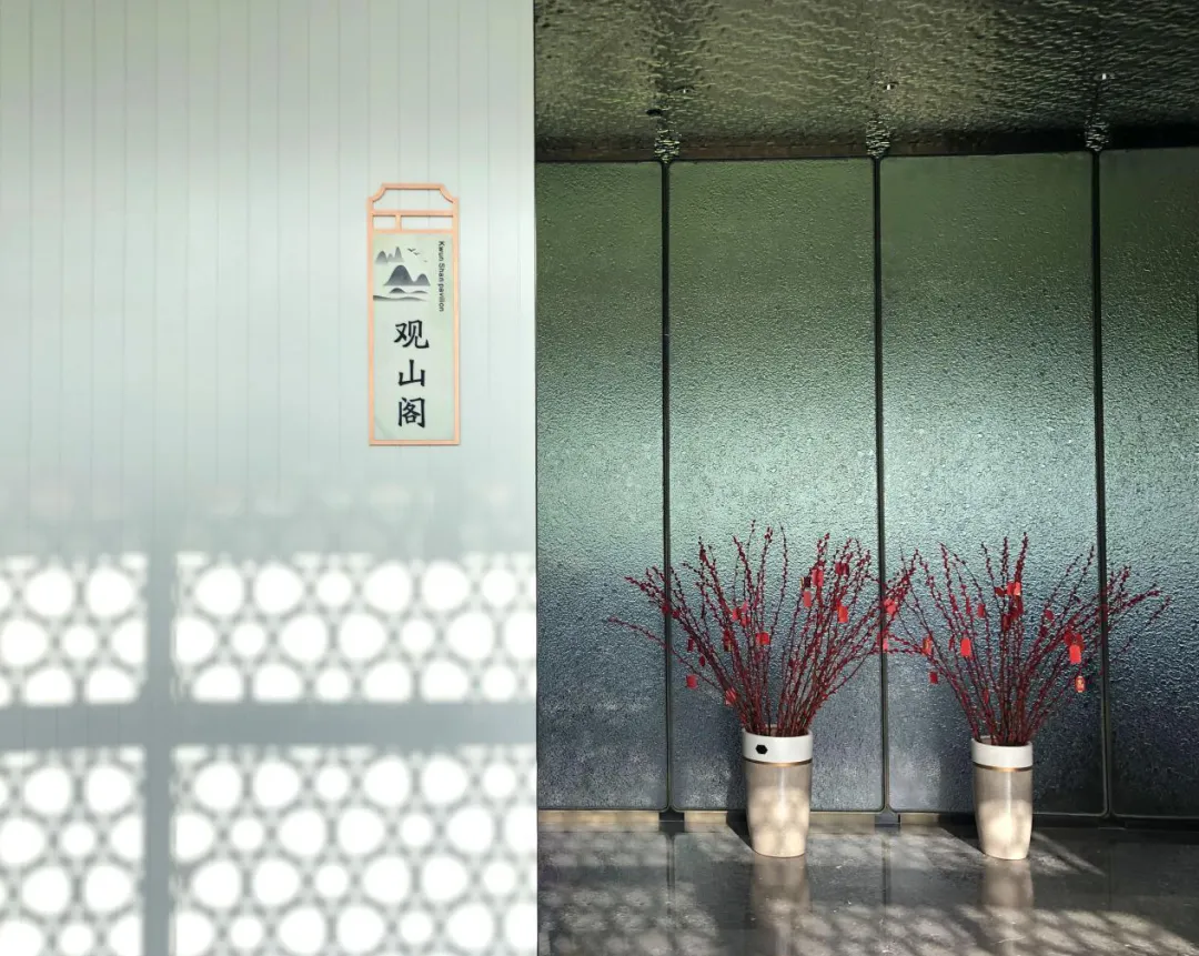 『观山阁』顾名思义:就是餐厅的位置正对着连绵山景,『观山阁』位于桂海晴岚山水生活美学生活馆二楼南侧,因窗外正对桂海山脉而得名。