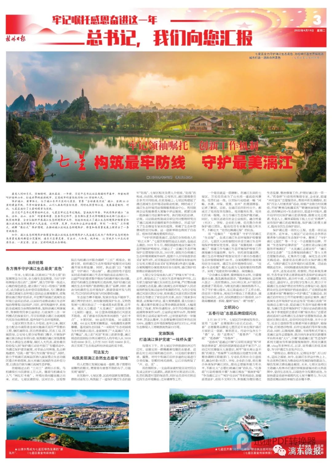 在习近平总书记考察桂林之后,七星区牢记总书记嘱托,坚决执行市委、市政府保护漓江“治乱、治水、治山、治本”的重要部署,区委书记郑平、区长郭红星多次带领辖区相关部门在漓江一线实地部署,全方位组织开展漓江生态环境保护工作。创造性地设立了漓江生态环境保护检察室和漓江流域生态环境保护人民法庭。以刑事、民事、行政和公益诉讼检察、审判“一体化”工作模式,破解“散打式”保护困境,在推动漓江流域生态环境保护、修复和高质量发展上探索出了一条有效路径。