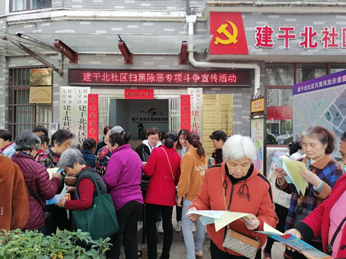 为持续不断地提高辖区居民对扫黑除恶工作的认识,维护社区治安稳定,打造舒适的居住环境。近日,建干北社区开展了扫黑除恶专项斗争宣传活动。此次活动,通过发放《扫黑除恶》宣传折页,普法志愿者向辖区居民面对面宣传扫黑除恶的重大意义和总体要求、举报范围,给居民讲解扫黑除恶的基本知识,向居民宣传打击黑恶势力的有关法律常识,鼓励引导居民遵守法律法规,积极踊跃揭发举报黑恶势力违法犯罪线索,共建和谐社会。
